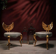 This image showcases a dramatic, dark, and luxurious setting featuring two highly artistic accent chairs. The chairs have striking gold-gilded...