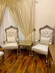 This image features a luxurious and cozy corner of a room with two matching, high-backed French-style armchairs. The chairs have...